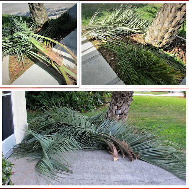 Of course we are making our lists and checking them twice........as we prepare for oOur annual trip north to Blake Lake, NY. Hotels are booked for the journey...visits with family/friends are scheduled. Lots of packing to do - but that's always saved for last. Still need to set up mail forwarding, pay ahead things like water bills, yard mowing and service etc.... AND so we are working now to make sure bushes and trees are trimmed, repairing/replacing a few sprinkler heads, cleaning the gutters. Picture below is of just a few of the bushes that we've trimmed, the resident woodpecker and...an unplanned job! Our neighbor, next door has a HUGE tree in their front yard, adjacent to our house. The roots from this tree are monstrous! Some of those roots have worked their way under our sidewalk along the side of the house........Rich, below working to remove the concrete pad, and then use his saw to cut out the tree limbs.